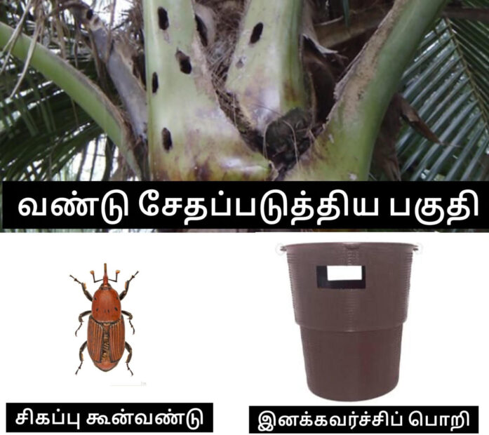 ஒரு ஏக்கருக்கு கரும்புச் சர்க்கரைப்பாகு 2.5 கிலோ அல்லது கள் 2.5 லிட்டர் + அசிடிக் அமிலம் 5 மில்லி + ஈஸ்ட் மாத்திரை 5 கிராம் இவற்றுடன் முப்பது தென்னை மட்டைகளை நீளவாக்கில் சிறு துண்டுகளாக்கி சேர்த்து தோப்புகளில் வைத்து கூன் வண்டுகளைக் கவர்ந்து அழிக்கலாம்.கூன் வண்டுகளைக் கவர்ந்து ஈர்க்கும் பெரோலியூர் எனப்படும் இனக்கவர்ச்சி பொறிகளை 2 எக்டருக்கு ஒன்று வீதம் தோப்புகளில் வைத்து வண்டுகளின் நடமாட்டத்தைக் கண்காணித்து அழிக்கவும்.